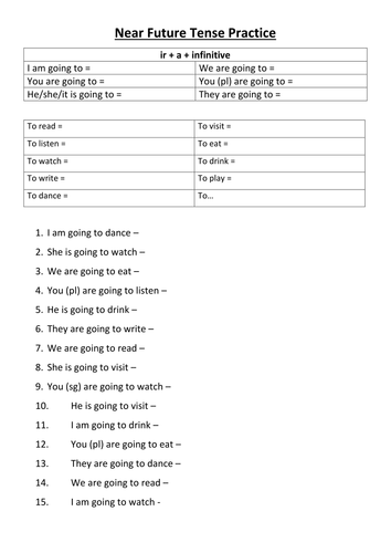 Spanish Worksheet Ir A Infinitive Conversational Future Tense Teaching Resources from dryuc24b85zbr.cloudfront.net Indefinite, continuous, perfect or perfect continuous) in the following sentences. Some of the worksheets displayed are ir a infinitive practice, ir a infinitive, infinitives, gerund and infinitive work, captulo gustar with infinitives 3, work, ir imperfect a infinitive, nosotros yo voy nosotras vamos. Links to quizzes, tests, etc. Talking about future with ir : When talking about what someone is or is not going to do, use the verb ir with an a, followed by an infinitive. The first verb is conjugated while the other stays in infinitive form. The infinitive form is widely used in english grammar. In this worksheet students get comfortable creating the conversational future tense (ir + a + inf) with 10 fill in the blank and 4 translation questions all in the present tense.