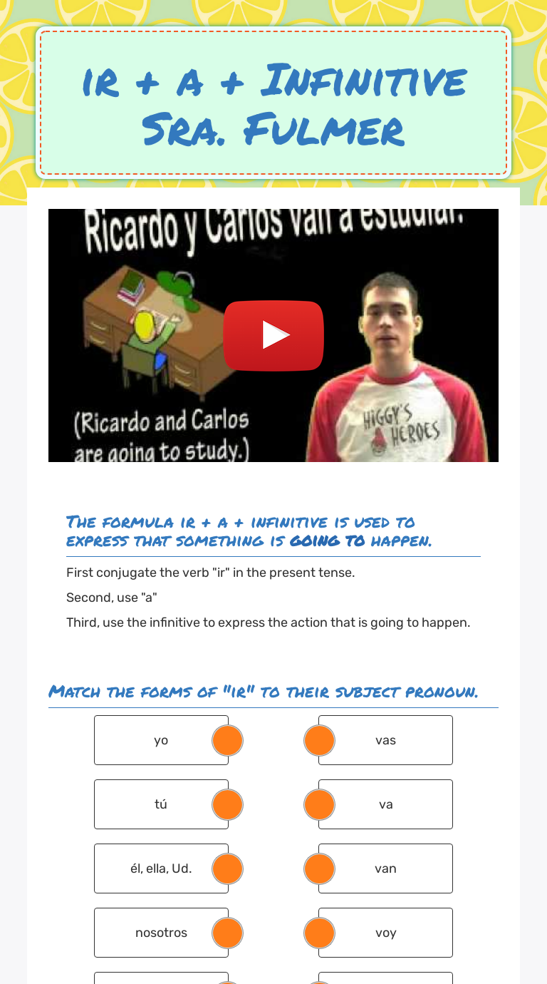 ir + a + infinitive . Worksheets are ir a infinitive practice, ir a infinitive, infinitives, gerund and infinitive work, captulo gustar with infinitives 3, work, ir imperfect a infinitive, nosotros yo voy nosotras vamos. A quick lesson in spanish explaining how to use ir a infinitive to express what you are going to do. Gerunds and infinitives esl activities, worksheets and games. Verbs followed by full infinitives.
